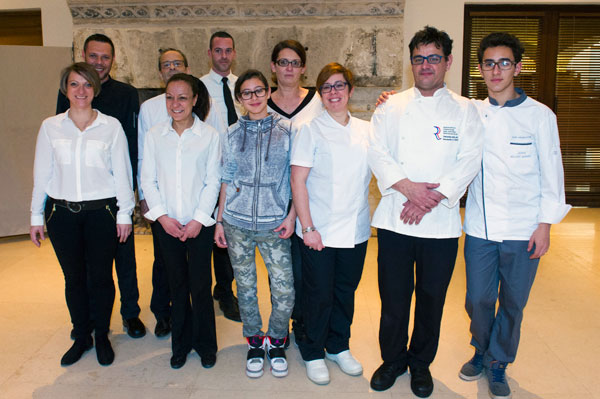 Avant et après le déjeuner autour de la Truffe, le chef Sebastian Gaillard, chef du restaurant La Truffe à Aups – capitale du Diamant Noir dans le Var – a partagé son savoir-faire pour la réalisation d’un somptueux Foie Gras truffé. Captivant le public, le chef Sebastian Gaillard a dévoilé une recette très simple à réaliser à partir de deux petites escalopes de Foie Gras poêlé sans dé-veiner, mises en forme dans un moule. La truffe vient en lamelles entre les deux tranches et le tout, enveloppé de film plastique et de papier aluminium, est mis à cuire lentement dans une casserole d’eau bouillante sous la laquelle on a coupé le feu.Les élèves on eut le privilège de déguster ce plat à la fin de la démonstration.