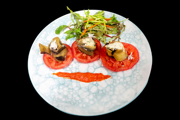 - Ballotins d’aubergines sur tomate Marmande et mesclun local