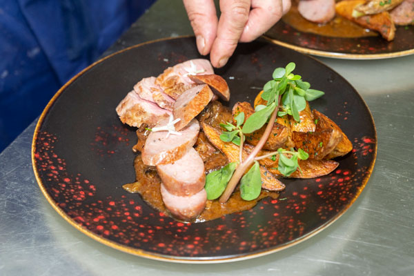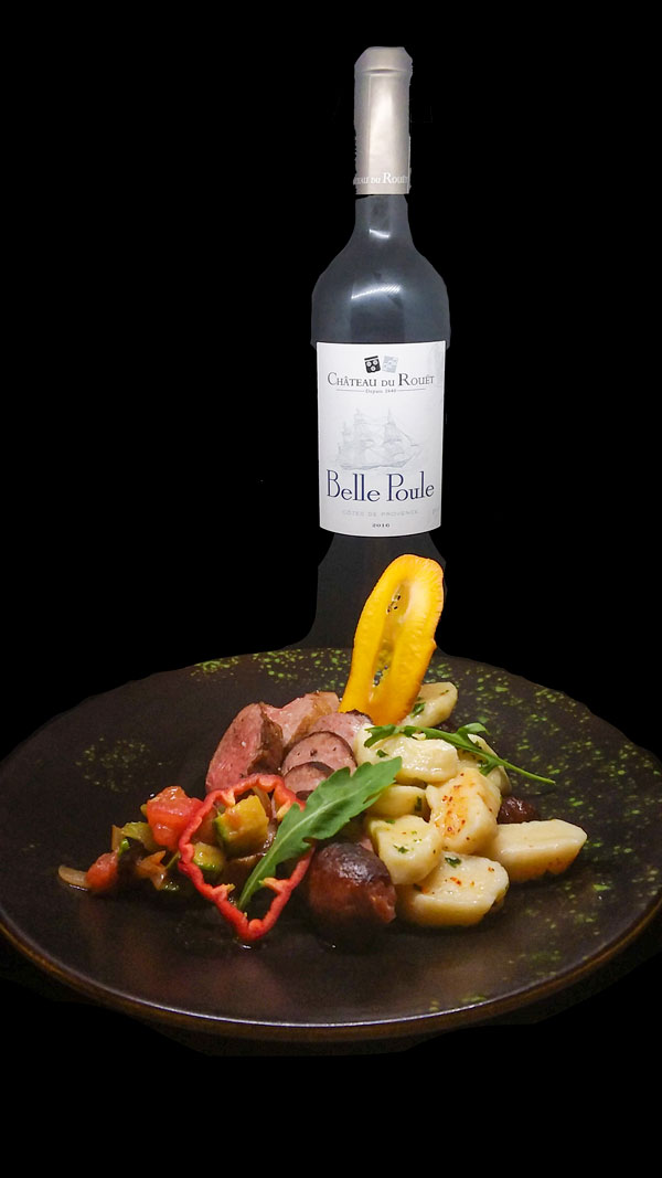 Les gnocchi maison, accompagnés des « Trois petits cochons », joue de porc braisée au porto rouge, pluma Ibérique et pérugines de production locale, tuile de curcuma: une trilogie d’émotion gustatives et onctueuses, portées par le jus puissant et aromatique, adouci par les tendres gnocchis maison concoctés par Yves Deront, le second du chef.