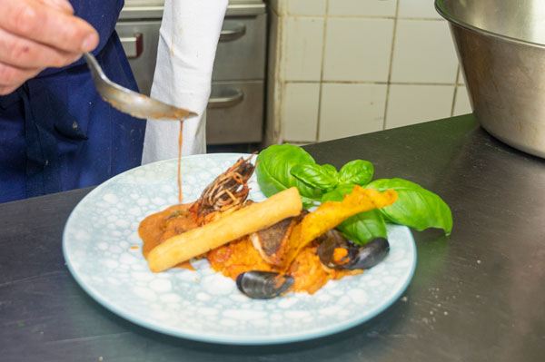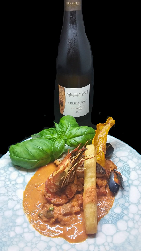 Gambas, loup et moule de bouchot, frite de panisse: les chairs délicates et tendres des produits de la mer, sublimées dans une alliance avec de beaux petits légumes du potager en forme de risotto, et nappées d’une succulent bisque de homard, gorgée de sucs de carapaces.