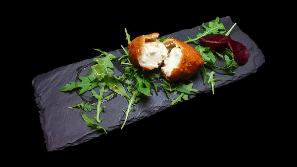 Croquette de chèvre des Courmettes sur roquette à l’huile de truffe: le fromage délicat, fondant et parfumé, légèrement salé et très frais s’accorde à la perfection avec le mesclun vitaminé.