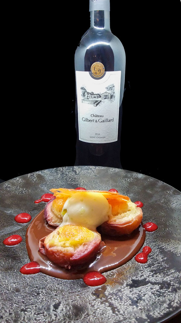 Pêches rôties à la crème d’amande et coulis de fraises de Carros, boule de glace au citron vert et tuile amandes: le parfum fruité et subtil de la pêche est délicieusement rehaussé par la fraîcheur vitaminé du citron vert.