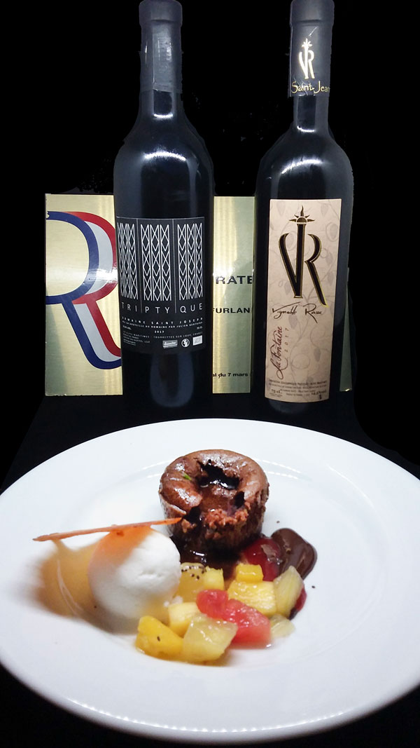Fondant chocolat et salade de fruits au sirop d’agastache: un gâteau fondant à souhait qui fait la part belle au chocolat coulant et fort en goût, une belle longueur en bouche, prolongée par le parfum sucré de l’agastache.