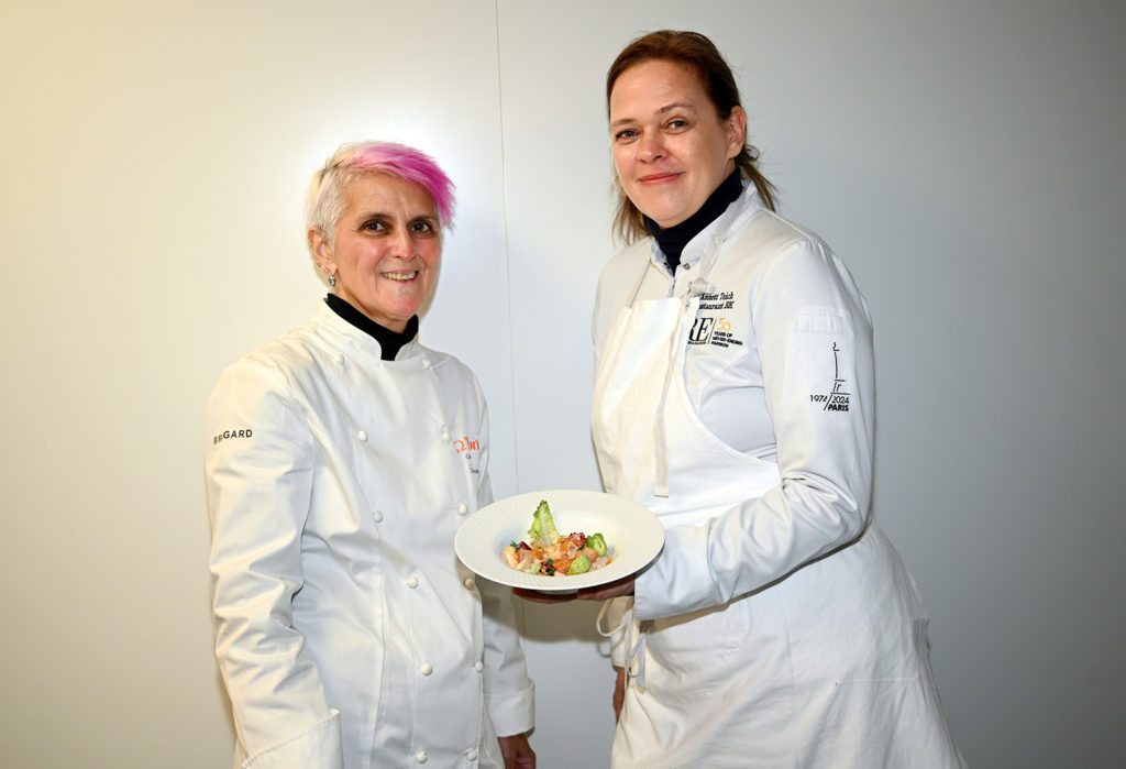 Pour cette édition symbolique, sept cheffes de renom – Isabelle Arpin (L’Auberge du Château de Leignon – Belgique) ; Cristina Bowerman (Glass Hostaria – Rome) ; Nolwenn Corre (Hostellerie de la Pointe Saint-Mathieu – Plougonvelin) ; Fanny Herpin (Le Camondo – Paris) ; Kelly Jolivet (Bistrot Benoit « Etoilé » – Paris) ; Hermance Joplet (Le Castellaras – Fayence) ; Annett Teich (Restaurant BK – Montagnac) accompagnées du chef pâtissier Lilian Bonnefoi (Meilleur Chef pâtissier de la Côte d’Azur, Brunch& Breakfast du Safranier – Antibes), ont imaginé un menu tissé d’audace, de terroir et d’émotions. De la daurade marinée aux agrumes, en passant par la barbue en mille-feuille de topinambours ou le croustillant chocolat-noisettes, chaque plat racontait une histoire : celle du partage, du savoir-faire et du cœur.