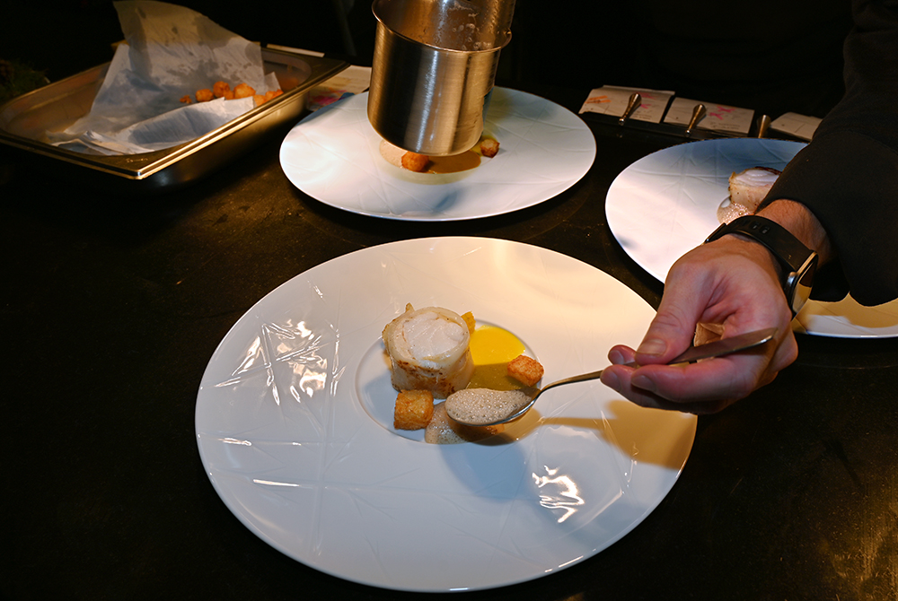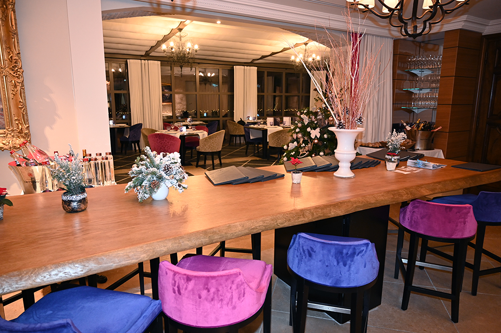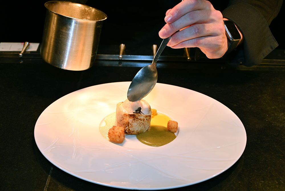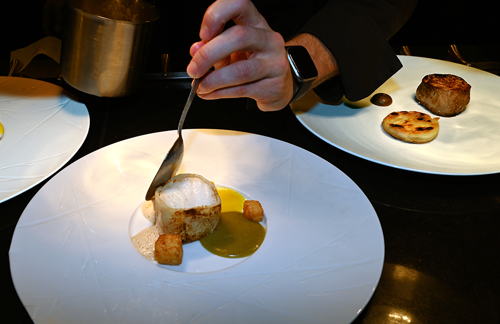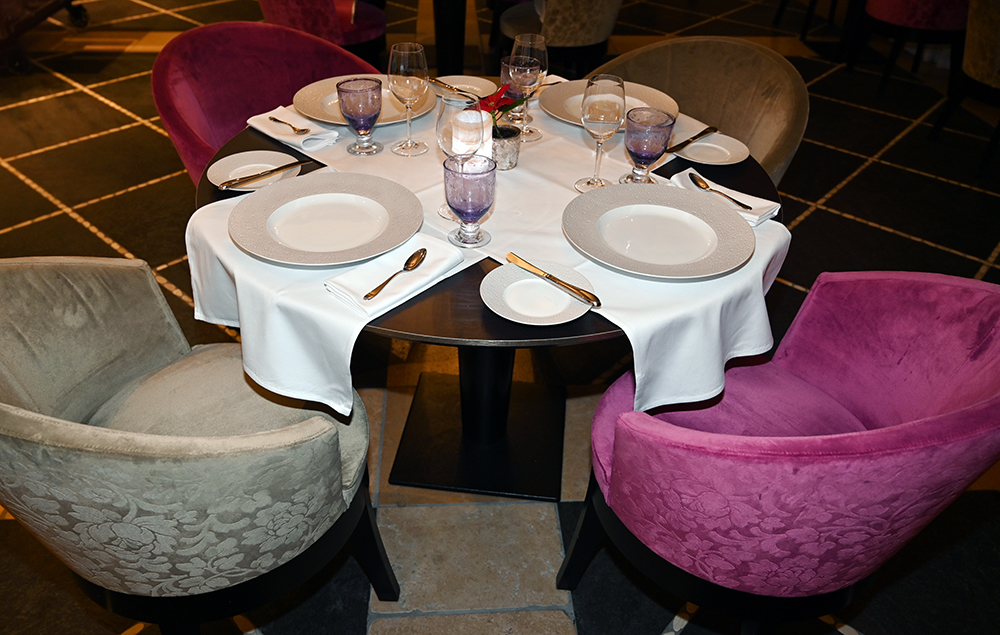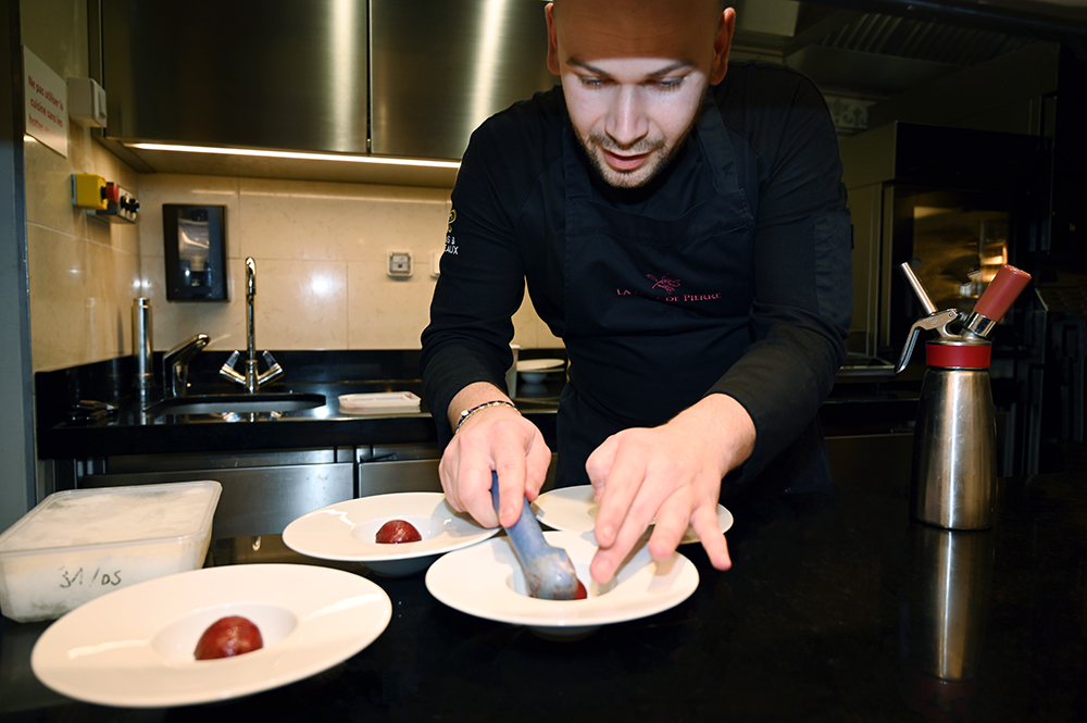 La Table de Pierre, le restaurant gastronomique du Domaine du Mas de Pierre s’ouvre directement sur la nature et sur les jardins, protégé par une baie vitrée rétractable dans le sol aux premiers rayons de soleil. Le chef exécutif Emmanuel Lehrer, qui chapeaute l’ensemble de la restauration, ainsi que le room service, le lagon et l’événementiel, a confié au jeune chef Maxime Leconte les nouveaux pianos face à une table d’hôtes de 14 places. Le chef de 28 ans opère depuis sa « cuisine spectacle », offrant aux convives d’assister en direct aux préparations et découvrir ainsi les gestes méticuleux du dressage des assiettes très graphiques, à l’image de l’art omniprésent sur le domaine.
