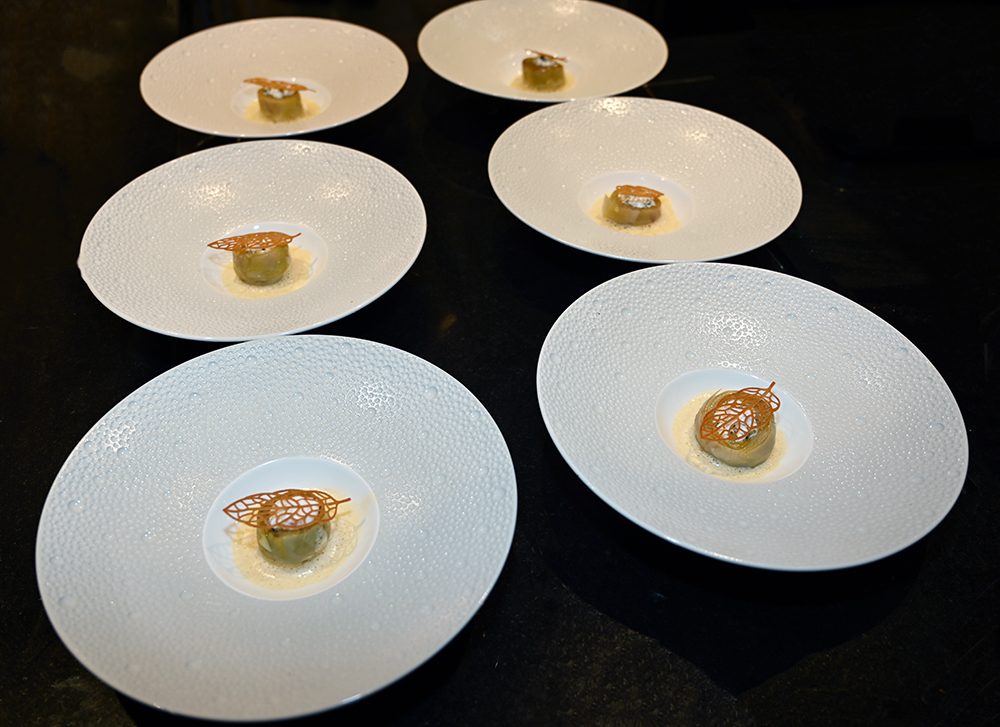 Cœur d’Artichaut, brousse de chèvre, blette, jambon Cérano, émulsion à la carbonara ©YesICannes.com