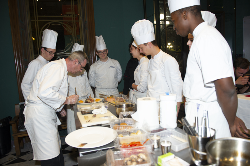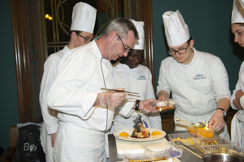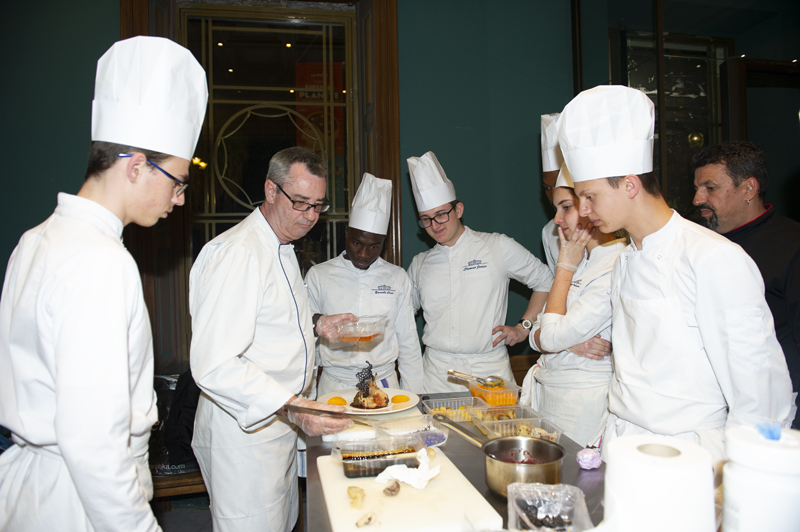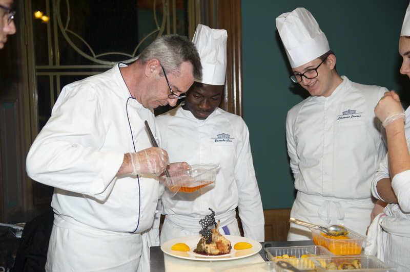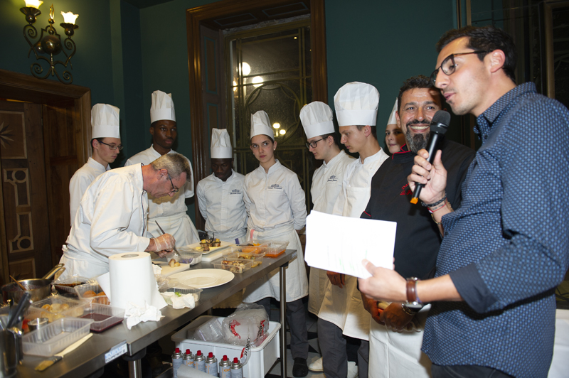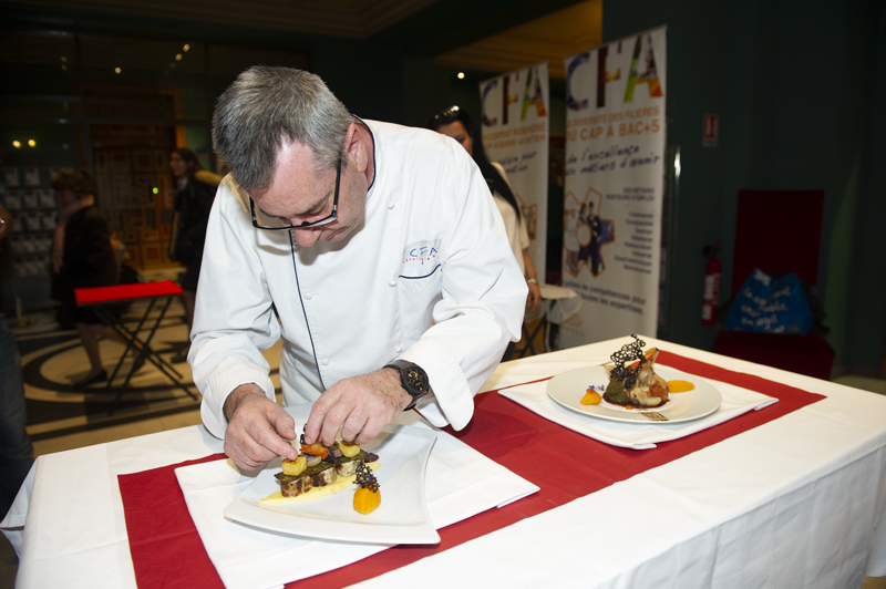 Une caméra mobile, installée dans l’entrée du CUM, a permis à l’assemblée installé dans l’amphithéâtre de suivre sur un écran géant la fabrication d’une gerbe de fleurs destinée à la marraine de l’édition ainsi que les apprentis cuistos et leurs professeurs de cuisine Luc Doré et Daniel Silvetti (Lu Fran Calin, Nice) en train d’élaborer une déclinaison de lapin en deux services: un Lapin à la Nicoise de Gairault, Purée de Butternut ou Oignons Grelot et Champignon. Voir également notre article sur l’hommage à Joël Robuchon et son dîner de gala élaboré par 12 MOF assistés des élèves du Lycée Hôtelier Paul Augier à Nice (https://yesicannes.com/fr/lycee-paul-augier-nice-hommage-joel-robuchon-51461).