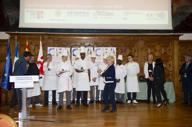La 1ère édition des Victoires de l’apprentissage, organisée avec le soutien de la Ville de Nice le 11 mars 2019, regroupait au Centre Universitaire Méditerranéen (CUM) des apprentis, des familles des jeunes diplômés, des personnalités de premier plan ou encore des représentants des branches professionnelles et des entreprises. La remise de trophée, agrémentée par des démonstrations culinaires et florales réalisées par les élèves du Lycée Paul Augier de Nice et du Lycée Paul Angevin à La Seyne-sur-Mer a ravi les pupilles et les papilles de l’assistance.