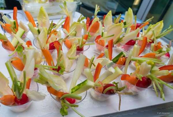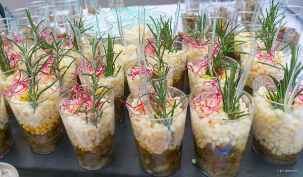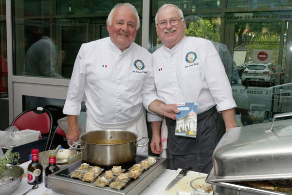 David et Noëlle Faure (Sensôriel à Nice): Volaille Rôtie et Confit à la Braise; Basile Arnaud (L’Hôtel de Mougins): Tartare de Daurade Brunoise de Mangue Condiment Citron et Mangue, Baie de Batak. Rédouane Mansouri (Le Blue Pearl à Villeneuve Loubet): Ceviche de Saumon rafraîchi d’un Guacamole Pomme Verte et Citron Vert; Stéphane Furlan (Le Sansot à Tourrettes sur Loup): Risotto aux Légumes; Jean Louis Rizzo et Jean François Philippe (Chefs à domicile): Tartare de Crevette Sauvage, Bouillon de Crustacé, Écume Chaude de Homard et Poudre de Corail, Suprême de Volaille Farci Fromage de Chèvre et Bette sur un Mixte de Lentille; Laurence Duperthuy (Notes de Cuisine à La Colle sur Loup) la Pissaladière comme à Nice. Akhara Chay de La Vague de Saint Paul a également régalé de ses délices.