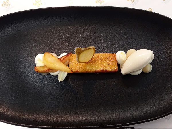 Le Foie Gras de la Ferme du Puntoun, reproduction d’un Citron de Menton, Coeur Coulant, Meringue et Croutons de Brioche: un sublime Foie Gras en clin d’oeil au Citron de Menton avec un coeur Marmelade de Citron, Crouton à la fleur de Cèpe, Meringue Italienne, Tuile. Une association remarquable de riche onctuosité sublimée de notes de fraicheur citronnées.
