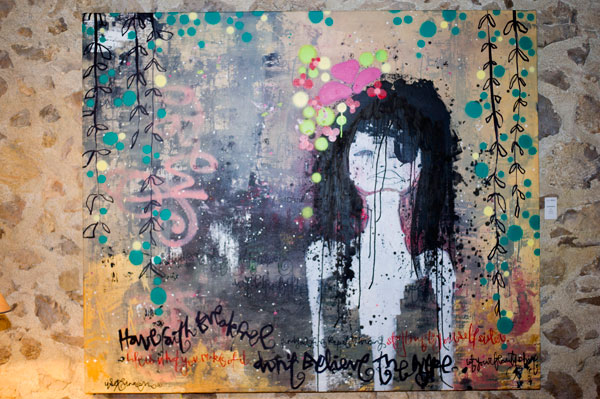 One finds in Lisa Rinneuvo’s art her three main sources of inspirations: fairytales, New York and kids. The paintings showcased at Villa Guide show children or young characters in a naïve way somewhat evoking Poulbot. Since her childhood in Stockholm where she was born, Lisa has been drawing, painting and writing stories and believes she is in fact a fairy. Admitted to the Pratt Institute, an art school in New York in 1998, she dropped out after one day, preferring to follow her own inner strength to find her own path. From 2003 to 2006, she painted in New York, just soaking up the energy of the city.