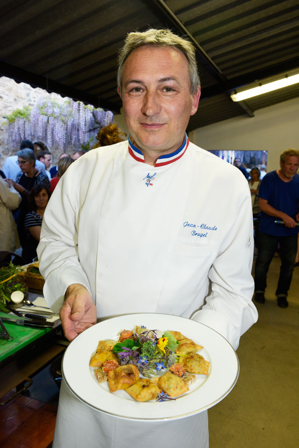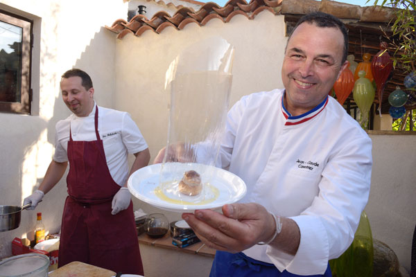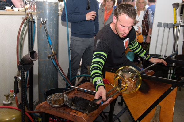 Throughout the evening, the Maitres Verriers played with canes before the admiring eyes of the guests, bustling with the new melting furnace, their breath giving birth to burning colored glass plates that were used to cook meat and fish prepared by the chefs. Then covered by a glass bell fashioned in the workshop, the live-concocted food gently simmered to naturally enhance an explosion of flavors that delighted the taste buds.
