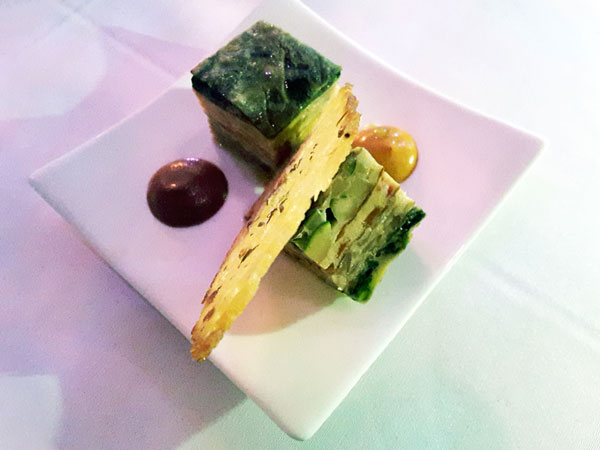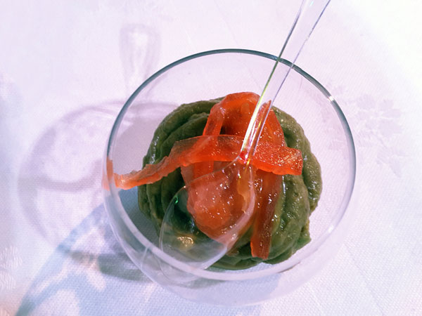 David Chauvac had prepared the amuse-bouche: Candille Crespeou, condiment in 3 colors. The cold appetizer was Denis Fetisson‘s creation: Carpaccio of Langoustines in Citrus flavors, Mango Coulis and Granny Smith Apples. The fish dish by Emmanuel Ruz distinguished itself by its originality: Zucchini Flower stuffed with Cod mousseline, Peas cream, vanilla Olive Oil. Franck Cicognola impressed the guests with his delicious boned Guineafowl, rolled in fresh herbs, with cooking juices, truffled Potatoes and bouquet of crisp Vegetables.