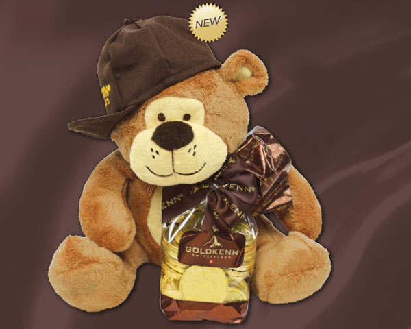 The Goldbear is a smiling bear, a furry friend wearing a Goldkenn cap and handling a sachet of refined, delicious Swiss milk chocolate coins. An irresistible quality plush, a nice way to delight cuddly and gourmand children.