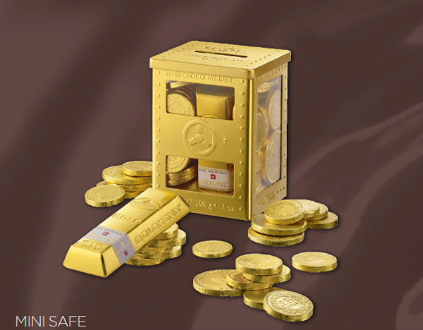 The Mini Safe for enterntainment, gourmandise and… savings: the treasure safe is packed with quality Swiss milk chocolate coins and one iconic mini Goldkenn Goldbar filled with Goldkenn pralines, prepared from quality smooth milk chocolate and blended with the finest almonds. Once empty, the safe can be used as a moneybox.