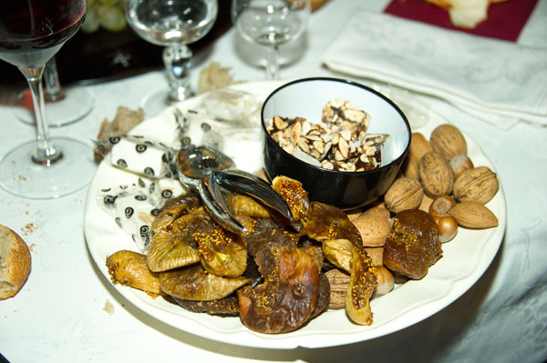 According to tradition, the vegetables must be present during the meal: chard, celery, parsnip or artichoke. Some starters and a vegetable soup precede a fish dish, all washed down with different wines.