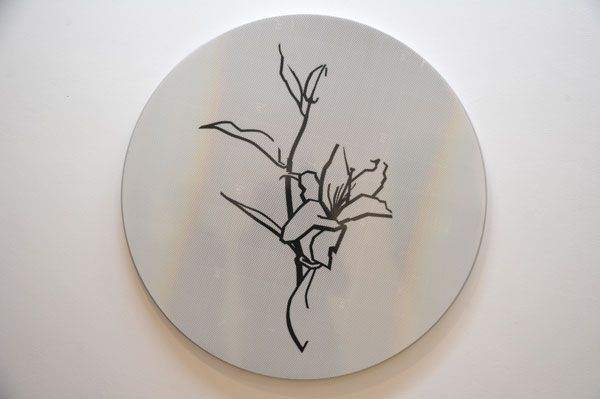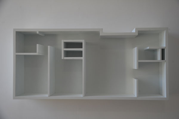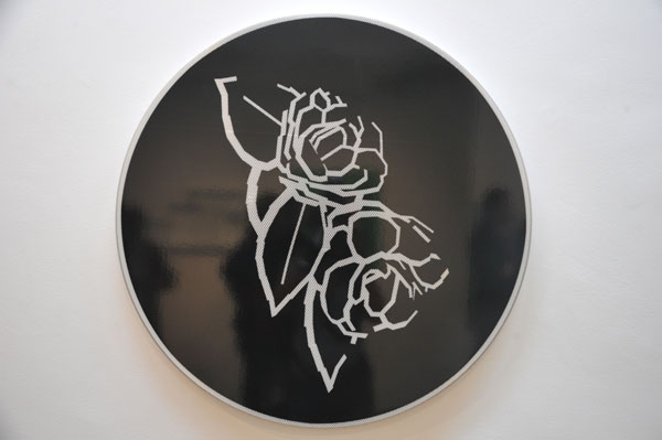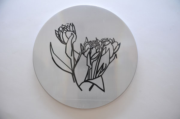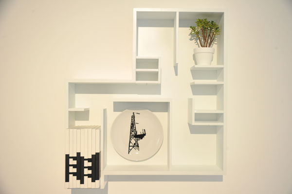 Road signs in floral pattern are hung on wall paintings in monochrome swatches evoking clichés of anonymous suburban architecture. White sculptures shaped as social buildings floor plans are diverted: they serve to display porcelain souvenir plates representing an electricity pylon.