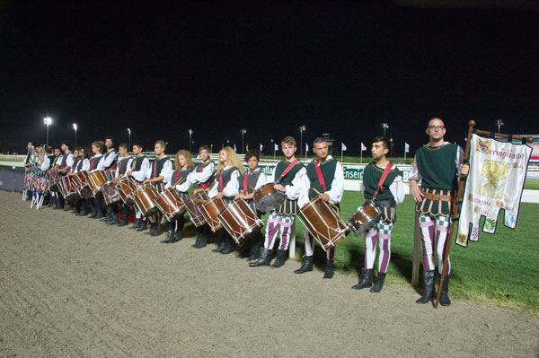 Musicians in traditional costumes and 25 flag throwers from Cavalcata del Assunta then marched down the aisles of the Hippodrome. Then, at 21h, in the stands, all the faces were turned to the racetrack, to attend the most anticipated race of the day under the sign of friendship and conviviality, the Palio de l’Amitié.