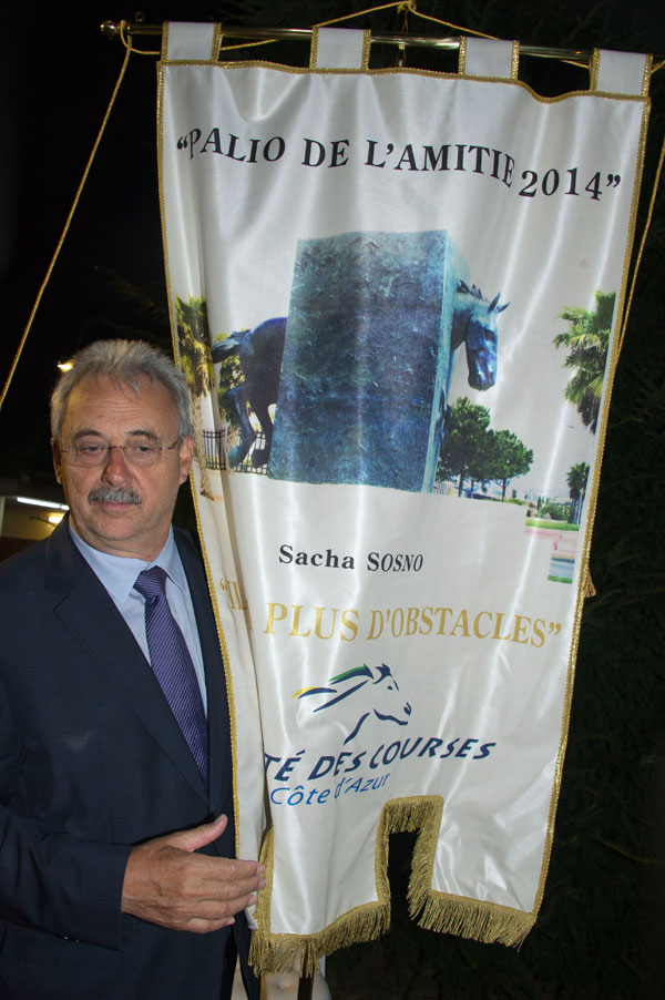 Le Palio is a flag velvet offered to the Cote d’Azur League of Racing by the city of Fermo, in gratitude for the organization of the Palio of Friendship 2014. In honor of the artist Sacha Sosno, it represents the monumental bronze “There are more barriers”, erected at the entrance of the Hippodrome.