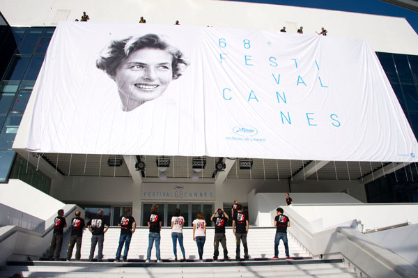 The Festival de Cannes 2015 official banner featuring Ingrid Bergman’s gorgeous face was hoisted on the three facades of the Palais des Festival.