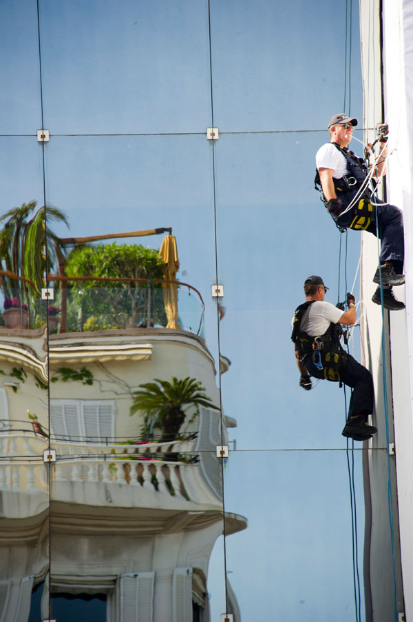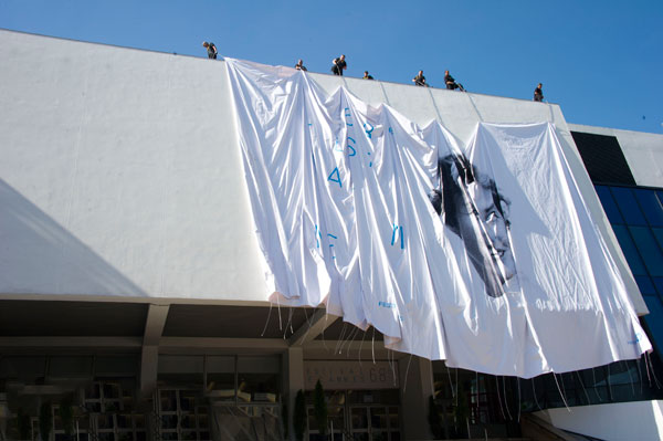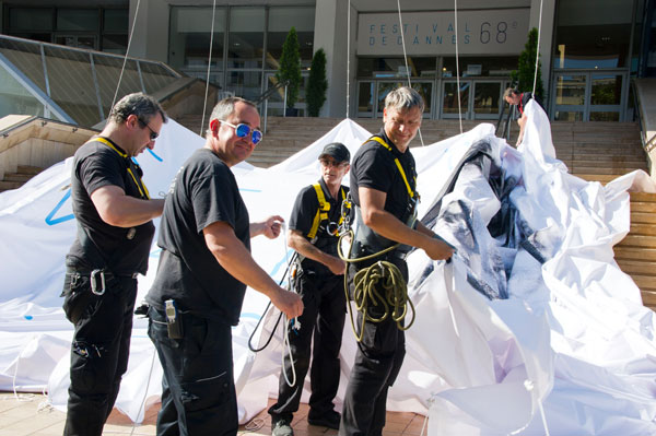 A traditional ceremonial pre-launching the Festival de Cannes, the hoisting of the official banner over the three large facades of the Palais des Festivals is awaited and photographed and filmed by a large audience of press and onlookers. The prowess is made by the Palais des Festivals staff who hoist the banner like a huge sail and then tie it on the sides, hanging on ropes like alpinists.