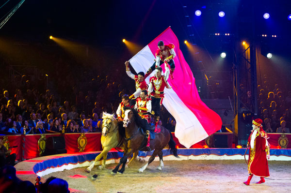 The Djiguites of the Elk Troupe opened the Gala with Cossack”high flying”, riding galloping horses, waving a flag in the end atop a human pyramid on two horses.