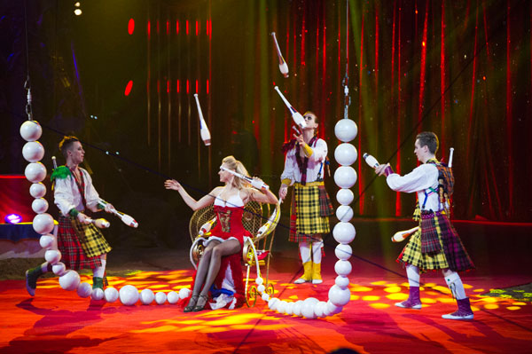 The beautiful and graceful Liobov Karsanova, from the Empress Troupe, dressed in a gorgeous red dress, swung in the air juggling clubs she sent to its partners.