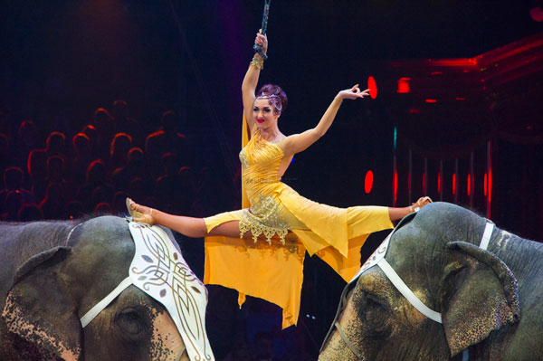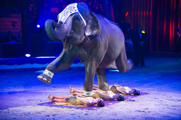 The Errani Family offered sumptuous show with elephant, with in the end, one elephant most carefully walks over three lying ladies!