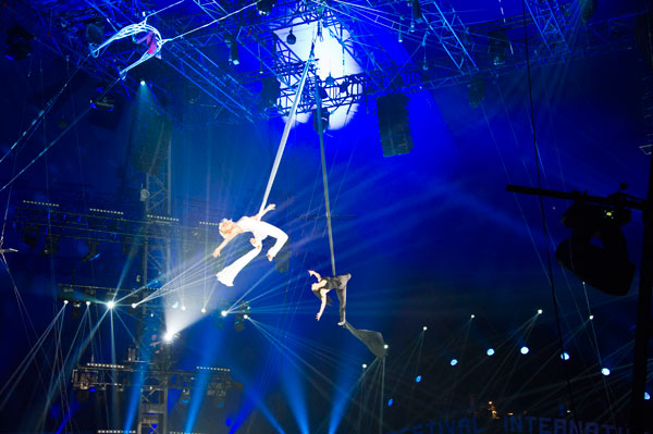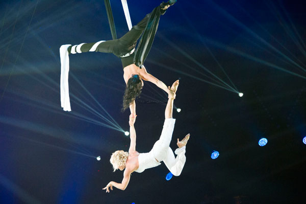 An act full of charm and grace: the aerial flying with ribbons offered by the beautiful Russian artists Elena Baranenko, the blonde in a white suit and the brunette Elena Petrikova, dressed all in black.