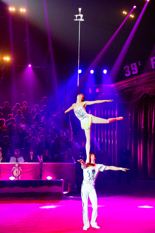 The acrobats Sin Chol Jin and Pak Song Hui, from the National Circus of Pyongyang, offered an outstanding acrobatic “pas de deux”, first on the track, with peaks balance and in the air, on a swinging trapeze with astonishing suspensions.