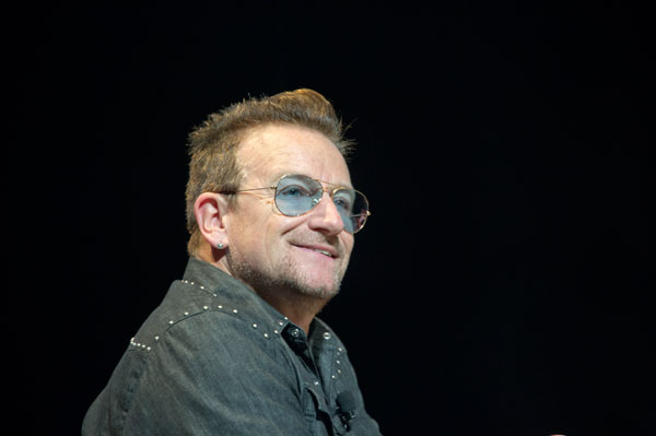 The audience laughed when Bono told the colorful stories of two distinct disagreements: one with Steve Jobs of Apple: “We had a a bit of fight over the parenthesis, which is the branding of Red,” Bono said. The other disagreements was with Edge, guitarist and friend of U2, concerning the appearance of Jesse Helms, a stalwart Republican from the south. Then he tackeld with seriousness and gravity the necessary assistance to raise funds for his organization which fights against AIDS by promoting (RED), a design product line for Apple (protective cover for iPhone and iPad).