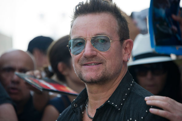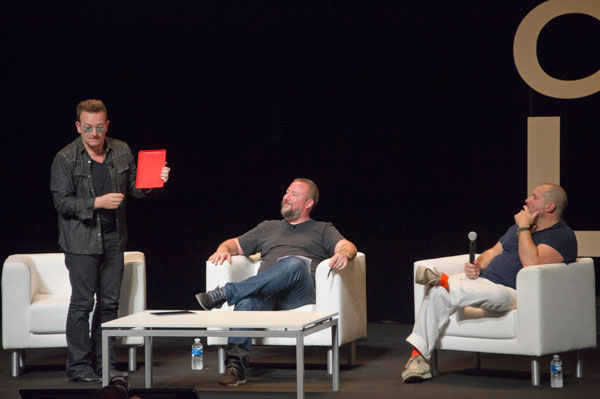 Boasting a Rock Star look, rockabilly hairstyle, bluish glasses, black ensemble with studded jacket and matching boots, so appeared Bono on stage at the main auditorium of the Palais des Festivals. He talked with Jonathan Ive, Apple’s vice president of design, a conversation moderated by Shane Smith, co-founder and CEO of media company Vice. The discussed for 45 minutes before an audience packed with fans.