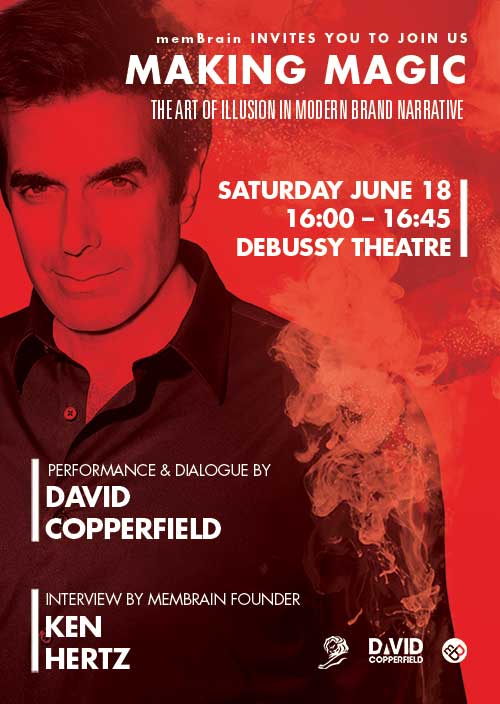 The best-known magician of our time spoked to a packed audience at the session Making Magic: The Art Of Illusion In The Modern Brand Narrative on 18 June at Theatre Debussy, hosted by Kenneth Hertz, founding partner of memBrain, the Beverly Hills-based company of entertainment, marketing, media programs and strategy consulting. The company represents major customers such as Intel, McDonald’s, Hasbro, Logitech… Kenneth Hertz is also senior partner at Hertz Lichtenstein & Young LLP, a Los Angeles-based law firm representing the interests of star artists such as Will and Jada Smith, Britney Spears, Keith Richards, Annie Leibovitz, Ariana Grande… The firm memBrain “creates value for its partners by harnessing the emotional power of entertainment and the passion of fans.”
