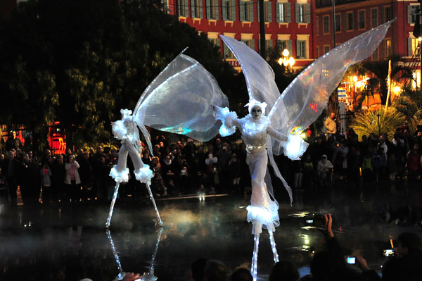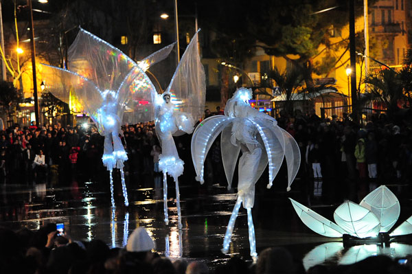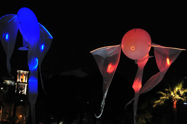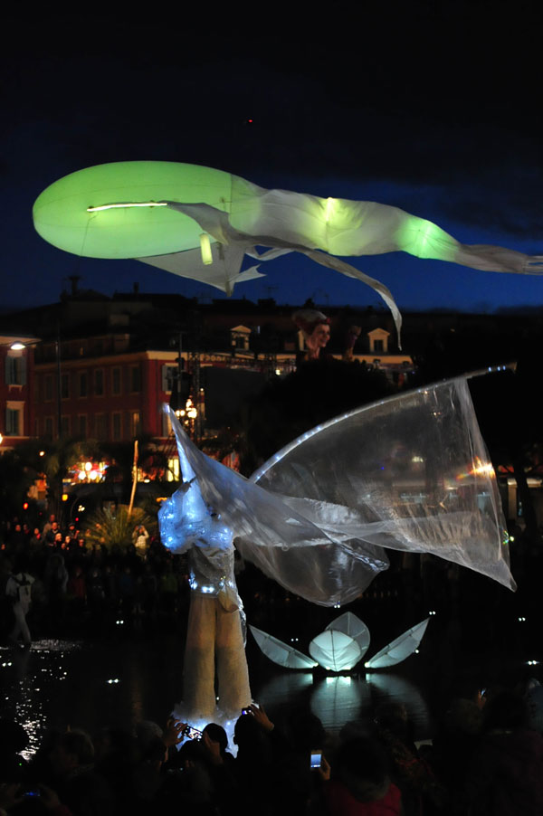 The free entertainment by the company “Porté par le Vent” – Carried by the Wind – offered by the City of Nice began Place Massena with the musical journeys of characters on the water mirror newly created Coulée Verte then gently stretched on the reflections of the water mirror. The enchanting spectacle of Lumineoles has the particularity to reveal all its beauty when the sun hides his.