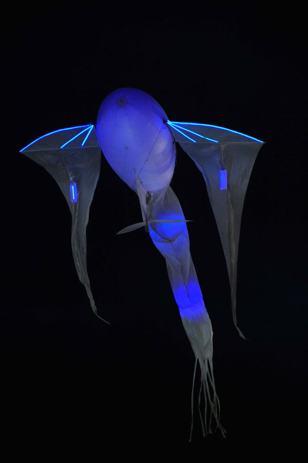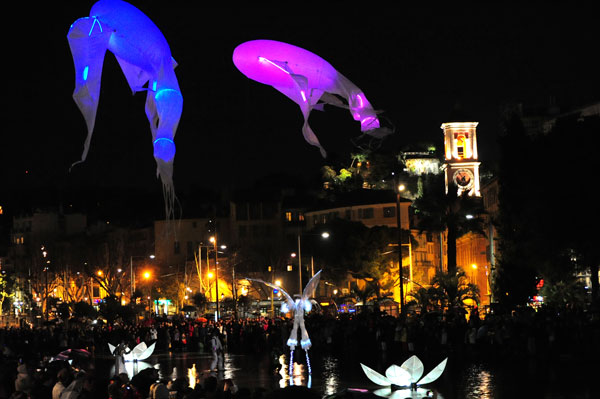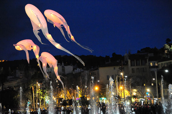 Before many enthralled spectators, at 30 meters high, with in the background the swirling illuminated Big Wheel dominating the landscape of Nice reflecting itself in the mirror of water, it was then a huge parade of sumptuous chimeras looking like illuminated flying fish, changing color in turn, through pink, blue or green.