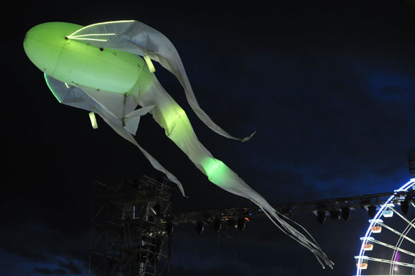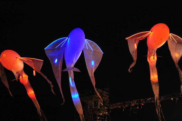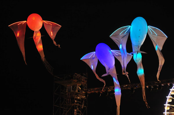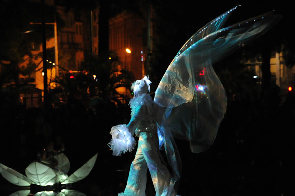 The show began with the wandering of dreamlike lit characters, three high stilt-walkers, three angels who gradually reached for the sky, deploying their slender wings. The magic of this poetic ballet continued with four Luminéoles, 15-meter long great birds of light with changing colors, began a wind dance in the sky, immersing the audience in contemplation and poetry.