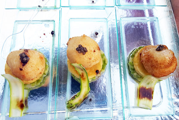 After a lecture on Sunday morning on the title of Maître Restaurateur at the Atelier and a demonstration of fish cooking by Mathieu Allinei (Le Bistrot du Port at Golfe-Juan), L’Atelier des Sens was entrusted to chef Guillaume Arragon (Le Bistrot Gourmand in Cannes) for a new demonstration of recipe with fish. In the afternoon, Guillaume Arragon and Mathieu Allinei were joined for a Show Cooking by the chefs Franck Cicognola (Mon Petit Resto in Mouans-Sartoux) and Jérôme Clavel (Le 44 in Antibes). Les Ratatouillettes, a collective of cooking enthusiasts, helped distribute the gourmande verrines to the public.