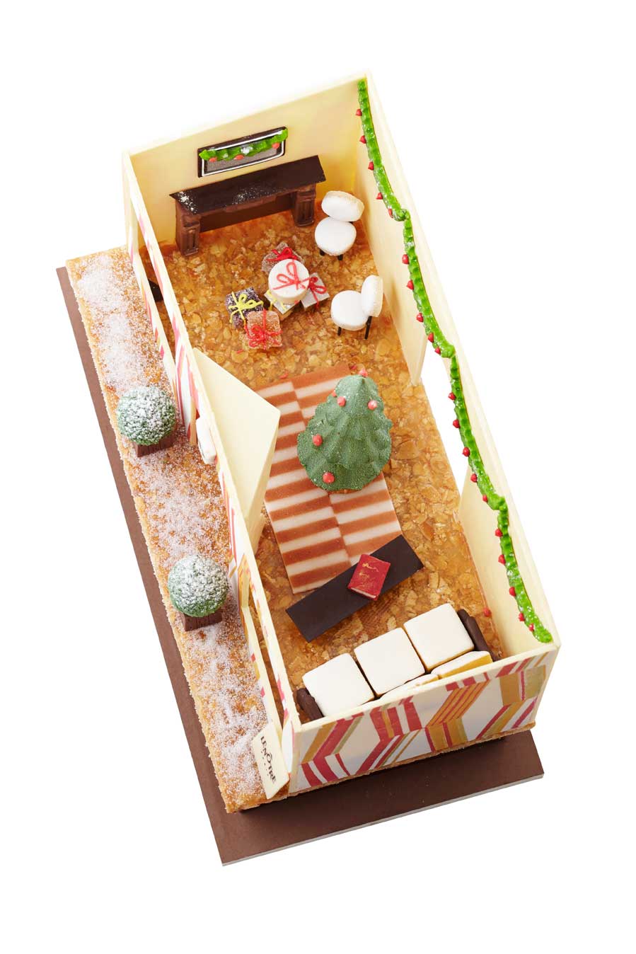 As in the tale of Hansel and Gretel, the house is entirely edible, although some will hesitate to eat at once such a beautiful work of Art… The family and friends gathered around the bûche will discover, through the windows of sugar, within the white chocolate walls, the warm and comfortable ambiance of a house during the Christmas and New Year holidays. The most gourmands will soon remove the chocolate roof of the miniature house to savor the armchair and sofa, made of chocolate topped with soft Calisson-like cushions and the carpet and curtains made of marzipan. A tentative pile of confectionery gifts lies by the fireplace of dark chocolate, at the foot of the Christmas tree of Gianduja chocolate.