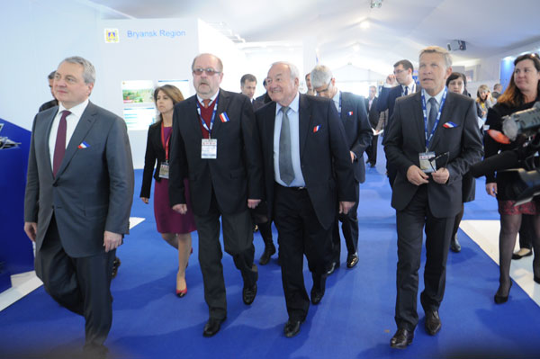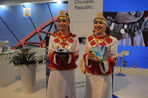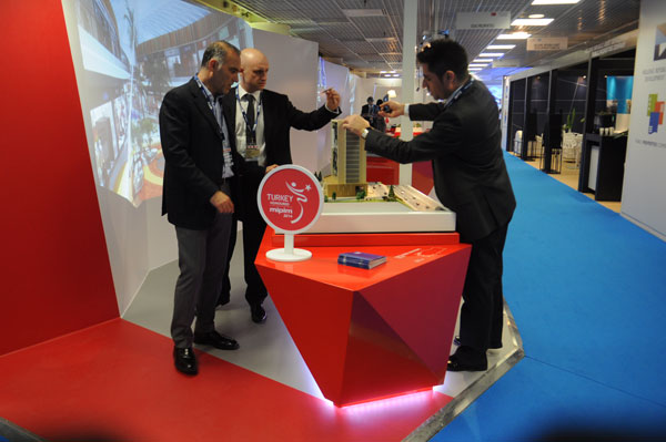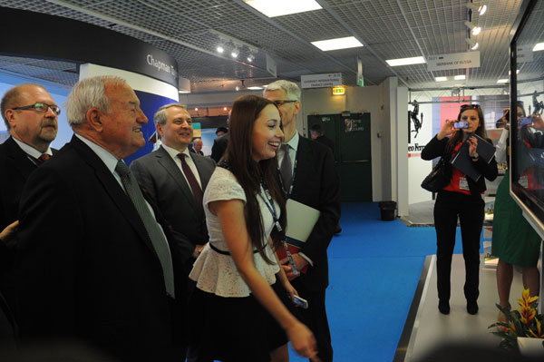 Officials toured the stands and admired the models of the grandiose projects showcased. On the stand of Brazil, which will soon host the FIFA World Cup, they had the opportunity for a photo shoot with footballs and the effigy of the trophy.