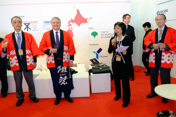 On March 11, a Kagami-biraki (Sake ceremony) was performed on the MIPIM 2015 Japan Pavilion in Riviera Hall to beseech the gods to grant harmony and good fortune over MIPIM Japan in the presence of (left to right on the photo) Rokushika Masaharu, Chairman Nihon Sekkei Inc., Ishii Kisaburo, Vice Minister, Ministry of Country Planning, Infrastructure, Transport and Tourism, Paul Zilk, CEO Reed MIDEM and Hatanaka Makoto, Chairman & Director Tokyo Tatemono.