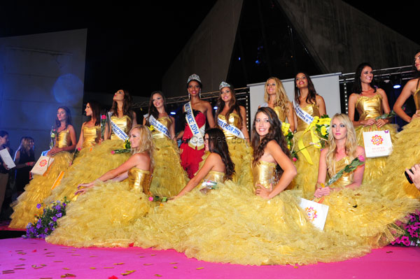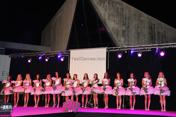 For the secondpassage in evening dresses created by Claudie Marco and André de Girdiano, they appeared like a bouquet of pink flowers in bustier and crinoline-like gowns, covered with tulle, a huge pink rose in the hand. At the mike handed by host André, the young ladies introduced themselves to the jury and the public, revealing their personality and motivation to fly the colors of the Cote d’Azur.