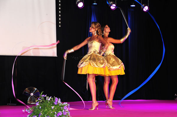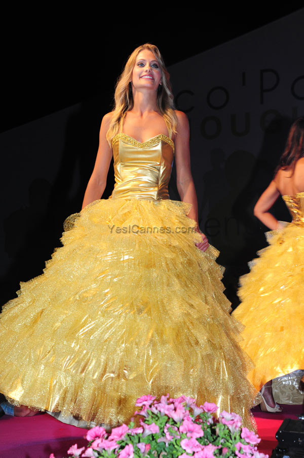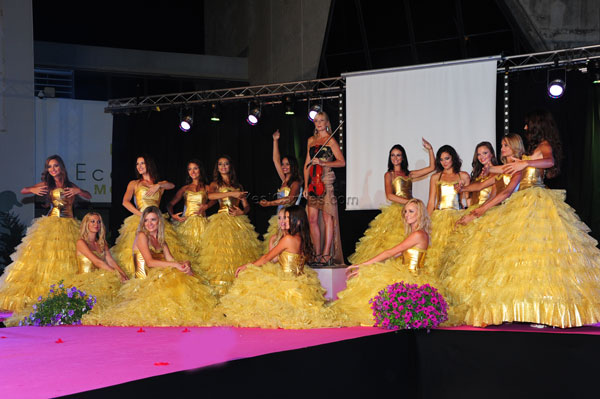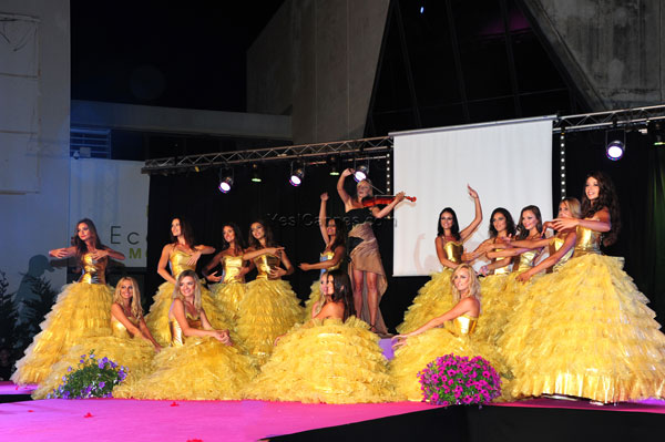 The fifteen young beauty queens paraded in group and one by one on the stage before the jury and 1,500 people of the public in a well-tuned show. They made four passages on stage, moving in graceful original choreographies, dressed in princess dresses. For the first pass, they had slipped in a short tight silver lame, created by Danielle Podossenoff.