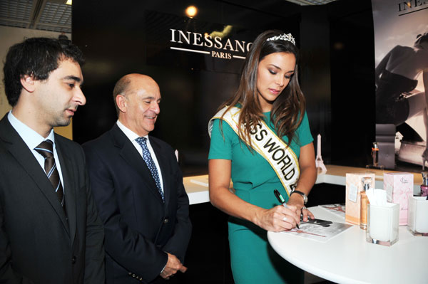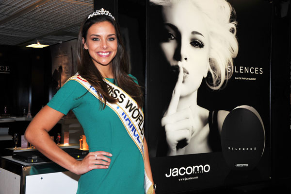 One of the most gorgeous Miss France ever, sublime Marine Lorphelin, former Miss Bourgogne, Miss France 2013 and first dauphine to Miss World 2013, created the sensation at TWFA  World Exhibition by appearing at the invitation of Jacomo. She embodies beauty, charm and elegance, all feminine values the new sents Inessance Beauté and Inessance Élégance intend to evoke and glamorise in each woman. Miss World was honoring of her presence the Jacomo booth to national  lauch Inessance Beauté and Inessance Élégance, accompanied by another Miss France, Sylvie Tellier, now Managing Director of Miss France.