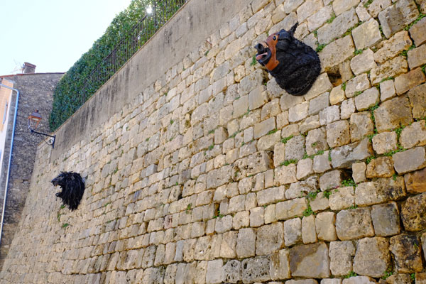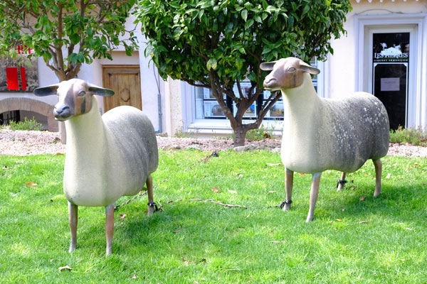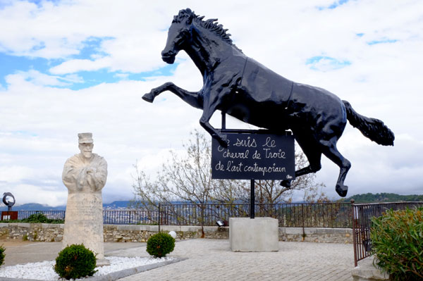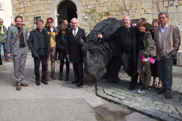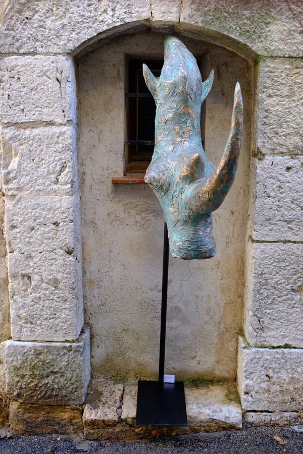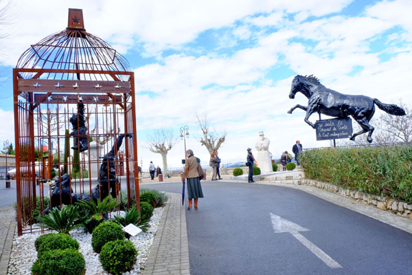 One will notice, among the animal works, sometimes hanging, sometimes resting on the ground, an ode to Amour Fou (Folon) and the Freedom of Béatrice Domenico, which poetry-filled, seem to fly away and join the sleek and slender birds by Folon, a horse, a cow, dressed with Ben‘s provocative”good words”, a couple of sheeps by Claude and Francois-Xavier Lalanne grazing the lawn of the Denis Fetisson‘s restaurant, La Place de Mougins, and are facing the hungry wolves by Davide Rivalta, Serge Van de Put‘s facetious baby gorilla and majestic horse… And amidst all these, a powerful bull of iron and steel by Domenico and Max Carier‘s stone warriors are watching over the entrance of the village.
