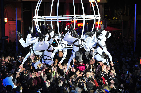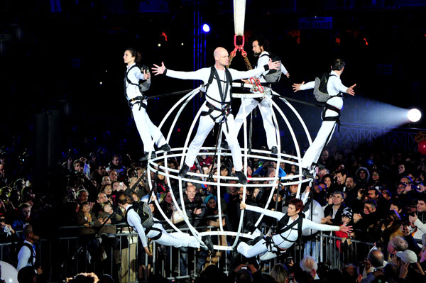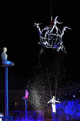 For the second part of the show, the compagnie hispano-argentine Grupo Puja presented K@osmos, an enchanting high altitude poetic theater show. Eight artists suspended at a large steel ball 50 meters above the ground that a huge crane lifts skyward. After many acrobatic figures during which they gave away large amouts of “confettis”, they hoverd over the public to shake hands with the viewers.