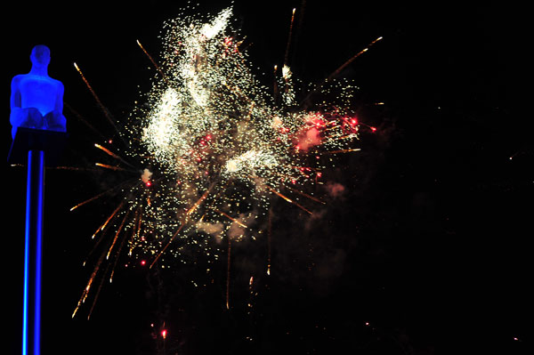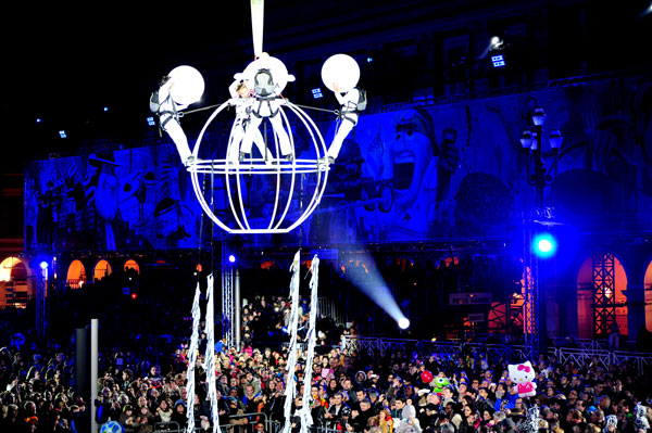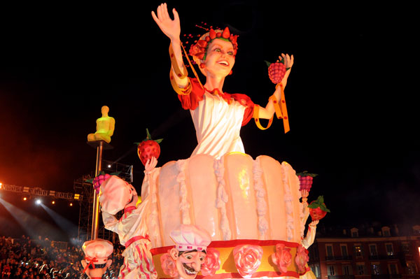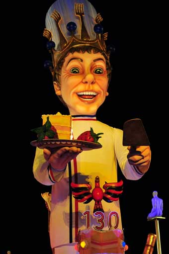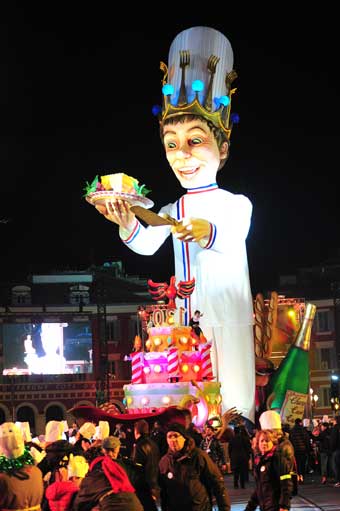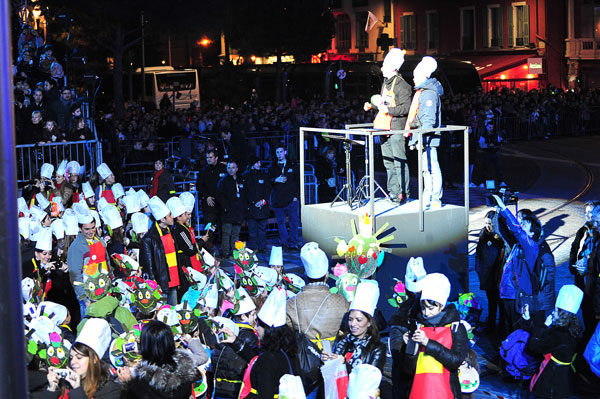 The Place Masséna was was brilliantly illuminated for the entrance parade of the floats of the King and Queen of Gastronomy. The smiling King is wearing a chef dress and holds a cake ready to be served and the gracious Queen’s gown is a charlotte with red fruits. The Nice carnival opening ceremony ended with a fireworks show around the statue of Apollo.