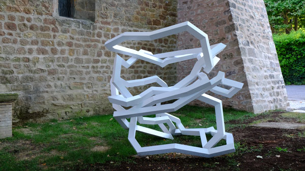 Nicolas Sanhes’ sculptures establish a resonance between the lines of their composition and the inner emptiness whose strength bears them. Painted white, the sculptures provide an impression of lightness and the color, combined with the diversity of lines, allows an infinity of works readings, with the lines downstrokes and upstrokes and the reflections of light on the faces of the IPNs which are not not perfect squares.