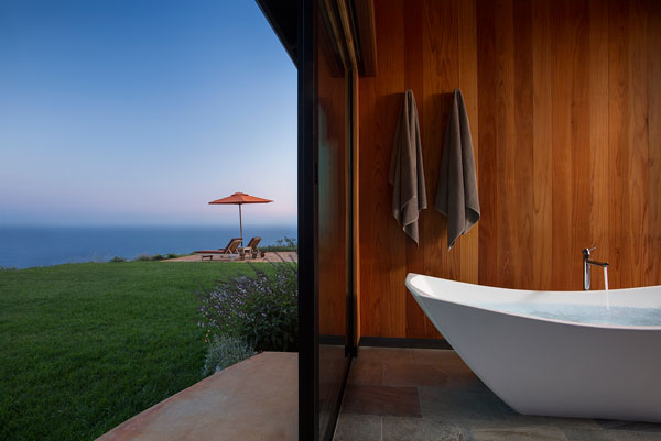 With a deck suspended at the edge of the ridge, the expansive ocean views of the extraordinary Cliff Houses can be fully appreciated from the outdoor hot tub and the large terrace, the indoor bathroom and the secluded bedroom with glass walls.
