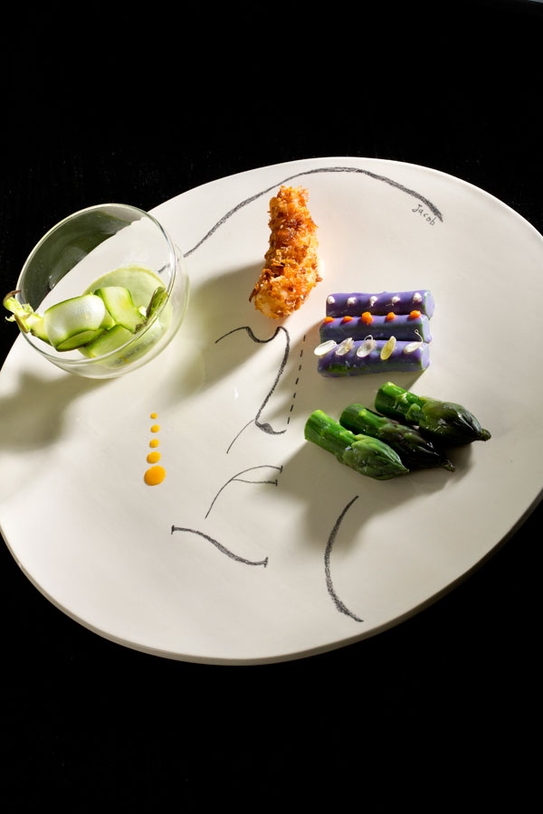 His taste for art, and ceramics in particular, led him to attend courses at the School of Fine Arts in Vallauris, and in 2010, he released with his wife his first ceramic showcases he uses as supports to his culinary inventions. For the creation of his supports, he is inspired by his accomplice relationships with painters, sculptors from different worlds like Moya, Steph Cop, Alëxone, Skaka, Laurent Mô, Scotie… The Cirque Arlette Gruss and the entertainment world also inspire him.