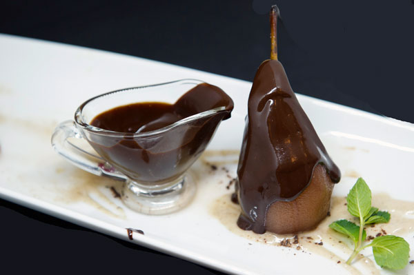 Pear poached in Port, Creamy Banana Sauce, Chocolate Sauce. The pear, dressed in its ruby dress, flavored with the perfume of Porto, comes back as a childhood memory in an ode to chocolate and fondant fruit. We savor this sweetness after dressing the pear with a delicious sauce with strong notes of cocoa on accents of fruit with fine, very juicy and fondant flesh.